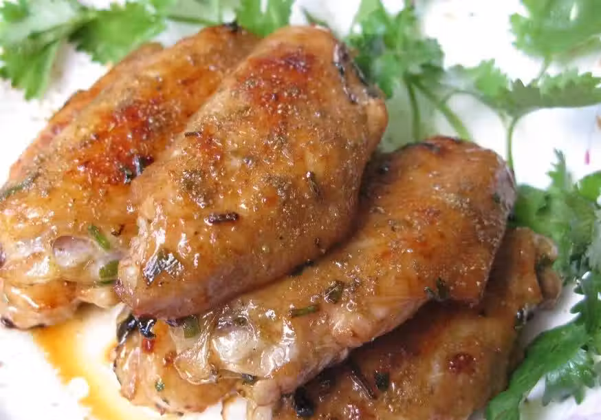 10、在雞翅上灑少許孜然粉,放幾片香菜葉裝飾。