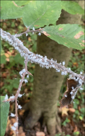 小小的樹枝上,是什麼小白花正在移動呢?原來,這個是蠟蟬的幼蟲,全身雪白,就像是一朵朵小雪絨花。