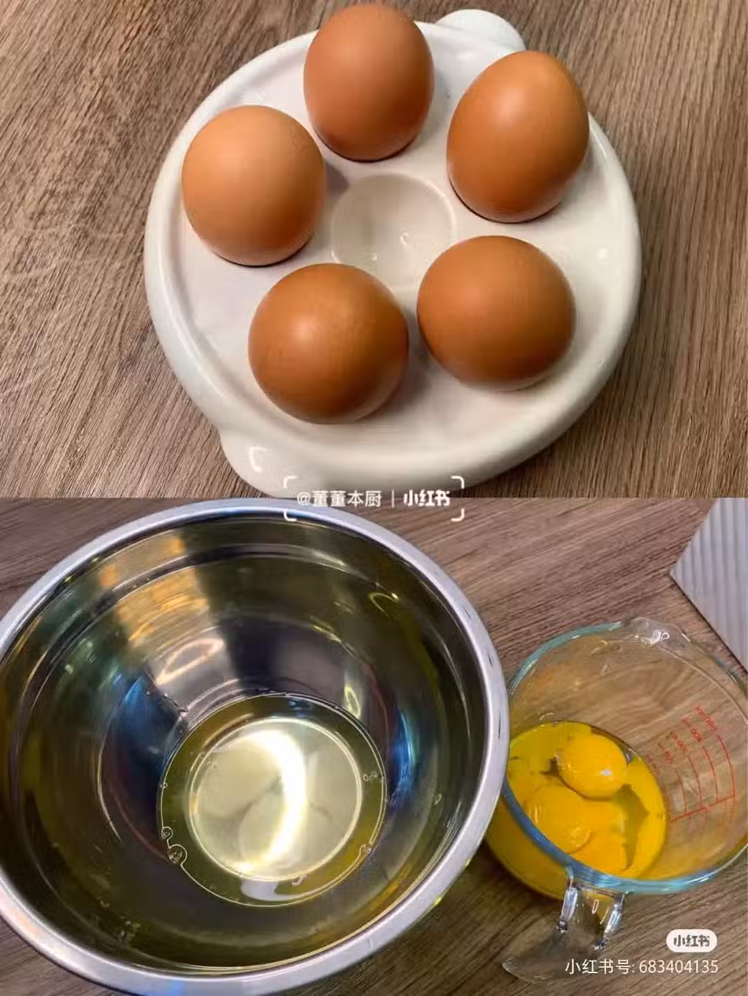 2] 4個蛋黃加一個全雞蛋,打散備用。