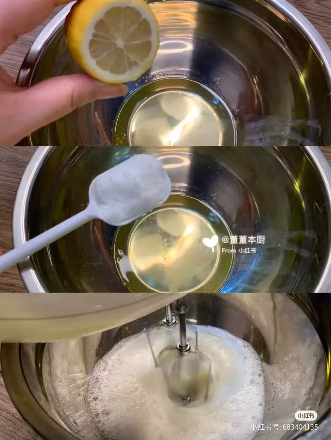 5] 蛋白繼續加糖打發,總之白糖不要一下都放進去,分三次放,最後打發到能看到三角,或者蛋白倒扣沒有滑下來,才算是打發合格。