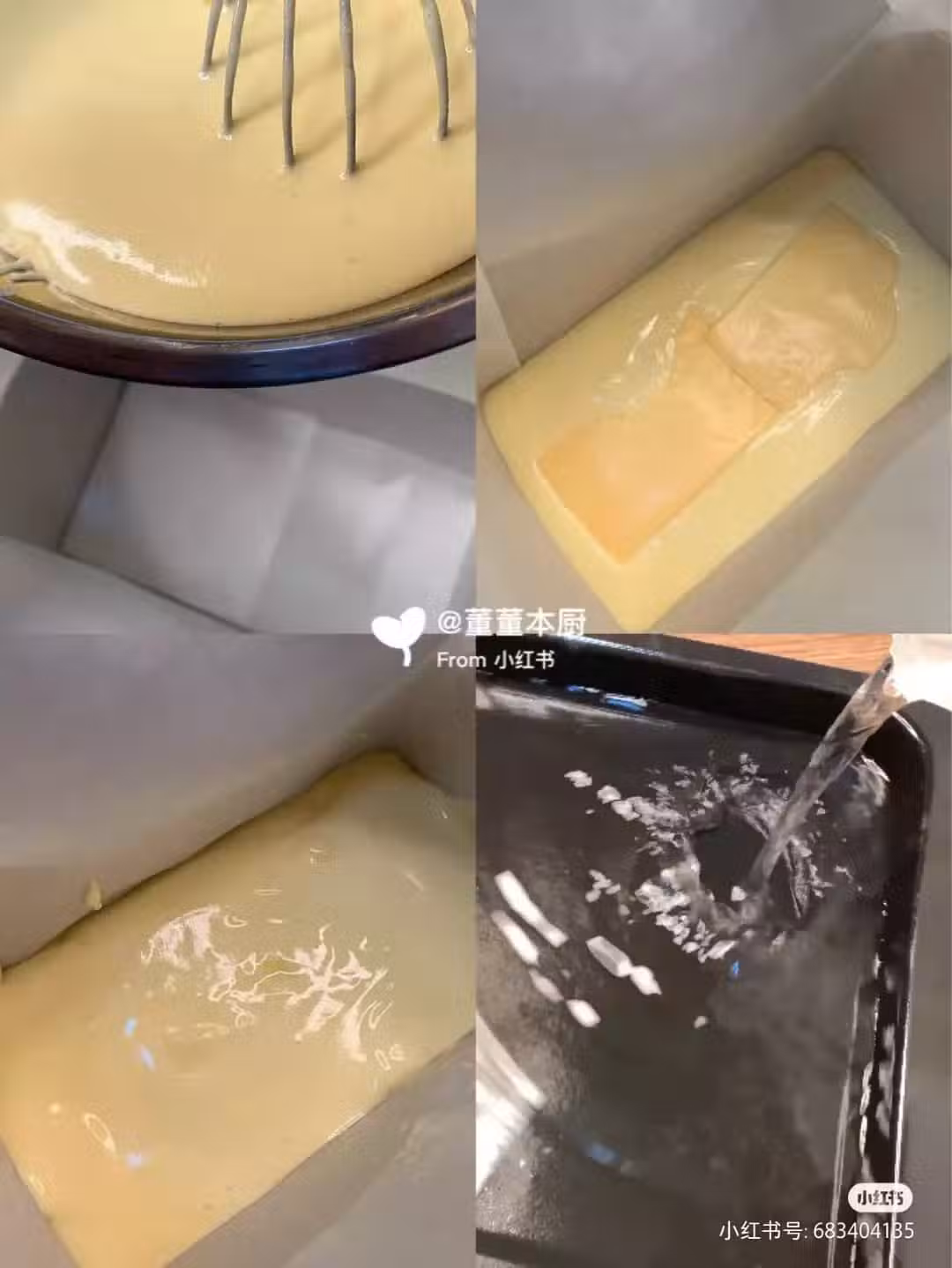 蛋糕採用的是水浴發烘烤,烤盤一定要放水。