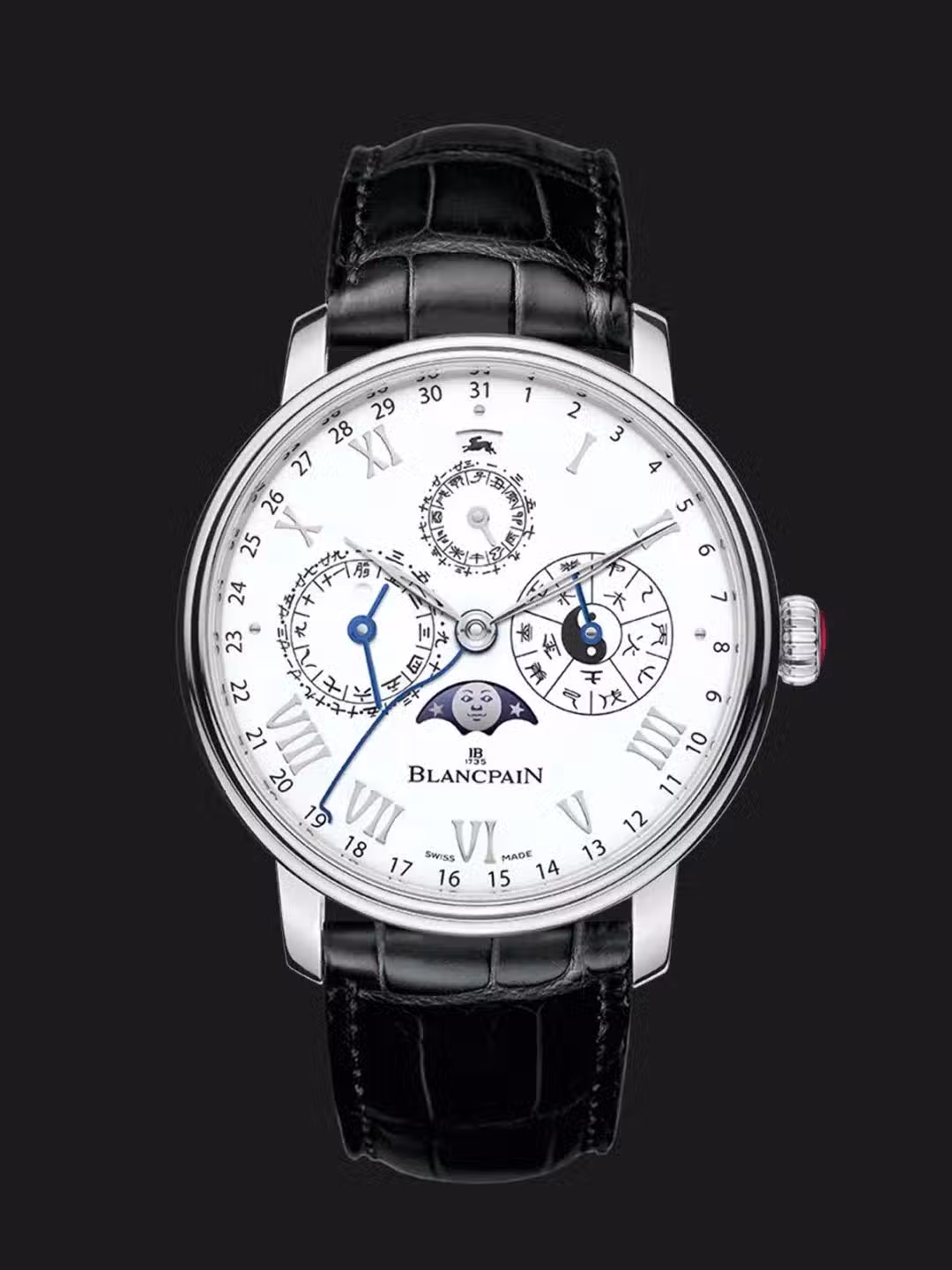 年份窗口下方的子錶盤顯示的是中國時辰。3點位置的子錶盤為天乾和五行。6點位置為月相盤。9點位置的子錶盤顯示的是農曆日期、月份和閏月。