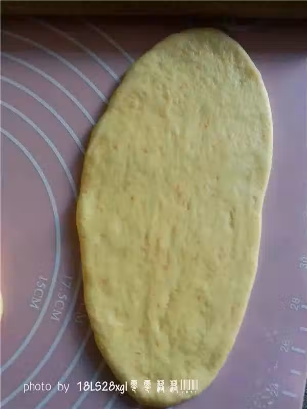 7、麵糰從上往下卷,一邊卷,麵糰兩端一邊往裡收,捲成中間鼓兩頭細的造型