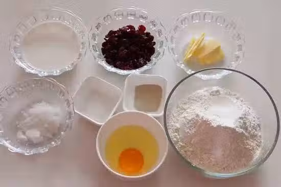 2、將除無鹽黃油、蔓越莓外的所有材料依次放入麵包桶中。選擇和面按鈕,揉至麵糰表面光滑(大概20分鐘)
