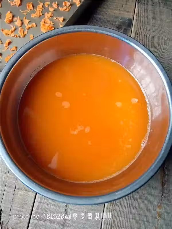 3、將65克胡蘿蔔汁、雞蛋、白糖、鹽放進麵包桶里,然後將麵粉、奶粉放進麵包桶里,然後挖一坑,把酵母粉放麵粉里,合上蓋子,啟動「和面」程序,和面程序結束後,將黃油放進去,再次啟動「和面」程序