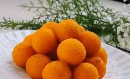 4.擠成大小均稱的丸子,放溫油中小火炸至全部在油中浮起,呈金黃色即可。