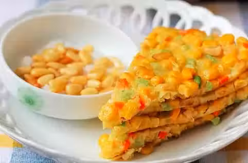 5、等到玉米烙底部凝固並金黃後,翻面,正面再加熱2分鐘即可,出鍋後,切塊即可食用,愛吃甜的可以表面再撒點糖,喜歡奇特的撒些番茄醬或是巧克力醬也是可以滴。