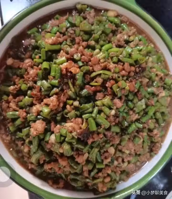 食材:豆角、豬肉餡、花椒、蔥姜。
