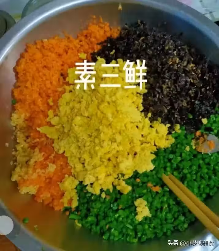 做法:木耳焯水,雞蛋炒碎,豆腐切小丁炒睡。胡蘿蔔+蝦仁切碎。生抽+蚝油+蝦皮+五香粉+雞精+鹽拌勻。