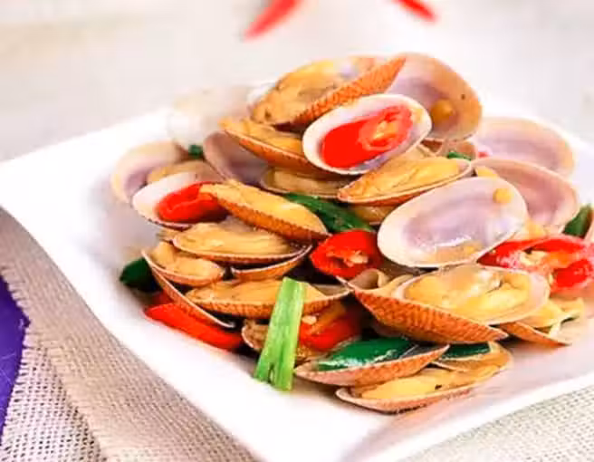 3、加入白葡萄酒,攪拌均勻,然後悶上鍋蓋3分鐘,花蛤會自動打開殼,不打開的扔去,翻炒2分鐘,讓花蛤入味,而後加水澱粉,湯汁粘稠即可出鍋了。