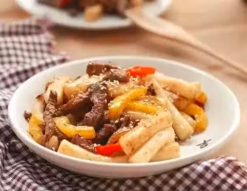 4、另起油鍋小火煸香洋蔥末,下年糕,加入2大匙黑椒汁、1大匙醬油、1小匙白糖和少許煮年糕的水炒勻,轉大火,倒入煸好的牛肉粒,快速炒勻即可。