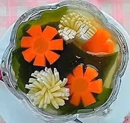 1、把豆腐切橫豎刀,最後面要連著一點不能切斷;胡蘿蔔先切片後切花;海帶芽取適量清水泡開。