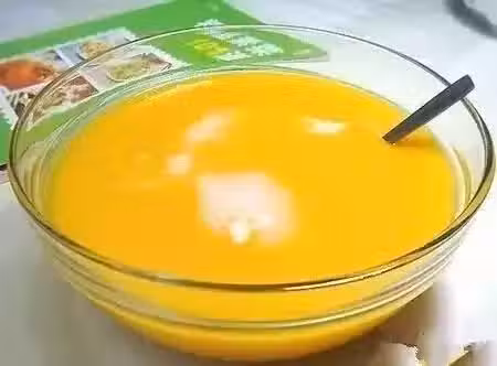 2、取部分南瓜塊放入攪拌機,加水(水量可決定湯的濃稠度,可稀可稠)、一小勺鹽(不要多,調出微微的鹹味即可),開機攪拌成細細的茸狀,倒出,在上面淋上少許的椰奶即可。