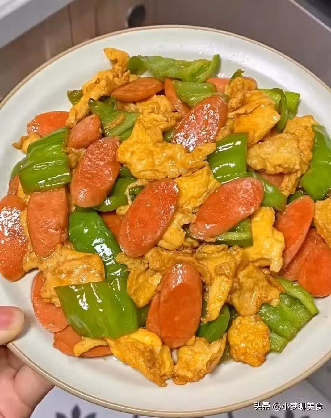 食材:青椒、火腿腸、雞蛋、生抽、蚝油。