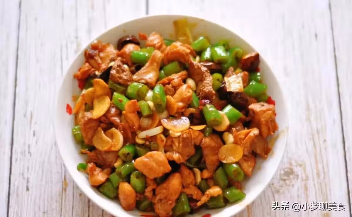 ④加入青椒翻炒,加入生抽、老抽、雞精,最後把干辣椒和花生米加入炒勻即可。