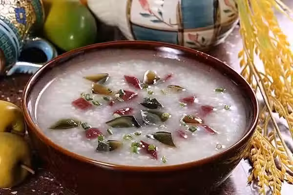 大米,皮蛋碎,蔥花,薑絲,肉絲,雞精