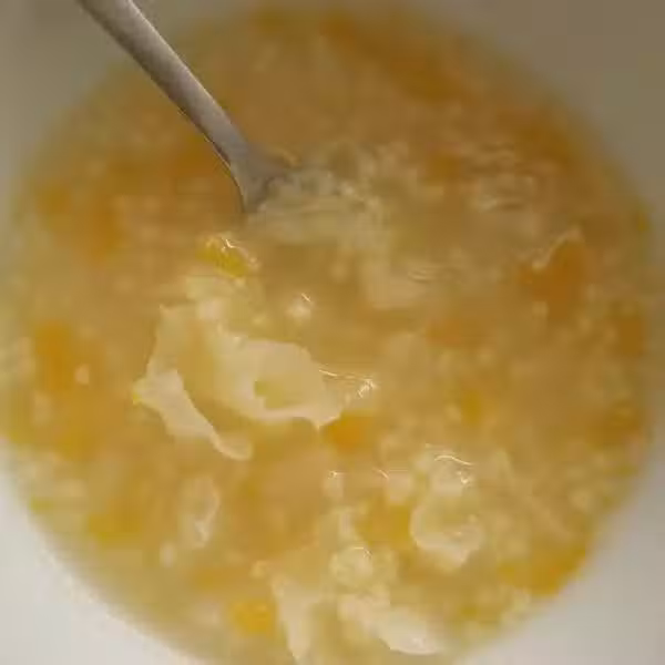 原料:小米150g、銀耳3g、冰糖50g、枸杞5克、食用鹼少許