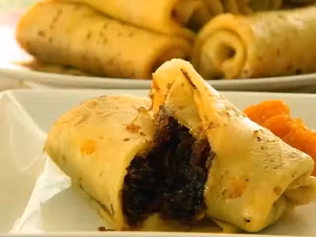 4)把稍微金黃色的皮往下,表層放入適量的餡料,像春卷一樣包起即可。