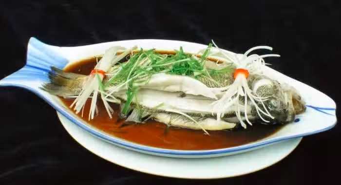 鱸魚1條;生薑絲3勺;香蔥2條;香菜10g;菜籽油40g;水40g;食用鹽1/4茶匙;醬油30g。