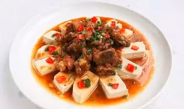 3. 把豆腐和排骨擺盤,蒸10分鐘左右,取出撒上蔥花即可。