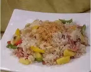 2.起油鍋,放入菠蘿塊、素火腿、蘑菇、三色彩椒拌炒,再放入白飯及三色豆拌炒一下,以黑胡椒、香菇粉調味,快速拌炒後起鍋盛入盤中,再撒上少許素松即可。
