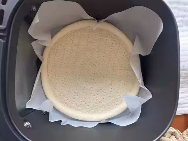 4、我們披薩的餅胚就做好了。放在油紙上,室溫醒上15分鐘左右。放進空氣炸鍋里,180度烤大約5-6分鐘左右,表面微微焦黃就可以。