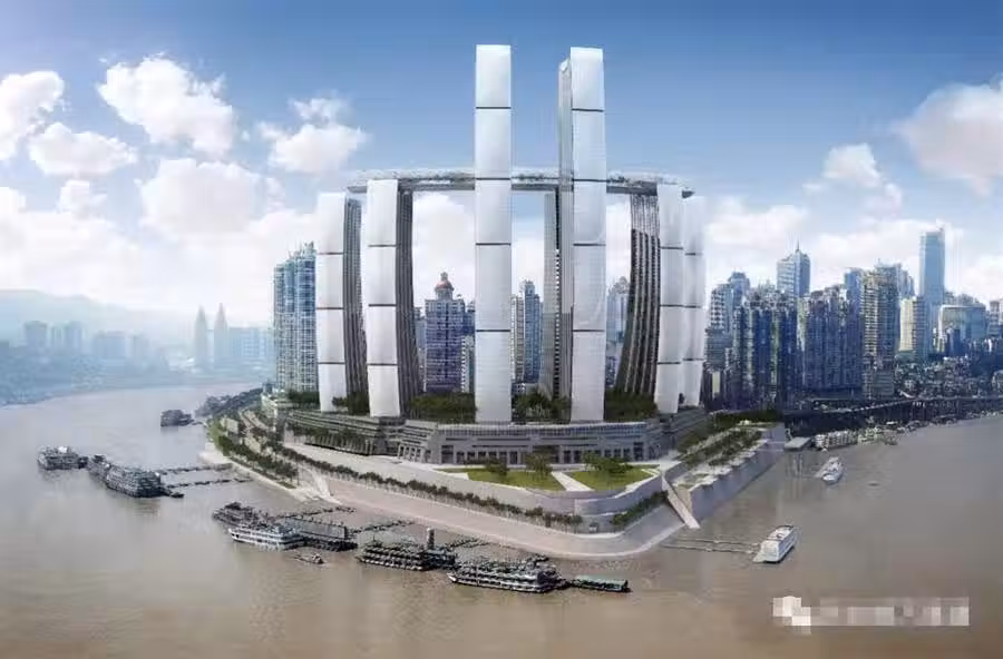 該項目投資花費近240億人民幣,總建築面積達到了110萬平方米,是目前新加坡在中國投資最大的項目。位於嘉陵江和長江的交匯處朝天門碼頭,從外觀上看妥妥就是新加坡濱海灣金沙的「雙胞胎」姐妹~