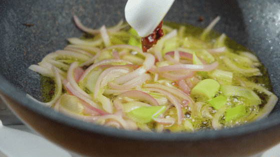 再加入花椒、豆瓣醬和干辣椒炒香。