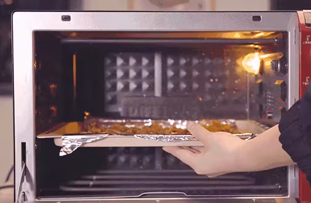 20分鐘後取出來,用手掰一下雞肉條,一掰就斷就可以了。20分鐘後取出,注意:雞肉條一定要烤成用手一掰就斷的狀態,否則再烤兩分鐘。