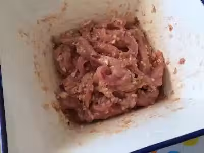 4)把洋蔥,蒜,五香粉,雞蛋,蜀粉,糖及鹽和瘦豬肉一起腌制至少2個小時。(*腌隔夜 味道會更美味)