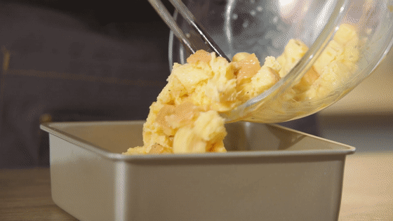 烤盤鋪好墊紙,蛋液吐司一起倒進烤盤裡鋪平。