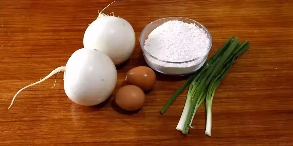 2個白蘿蔔,2個雞蛋,半碗麵粉,1小把小蔥,適量鹽,適量油。