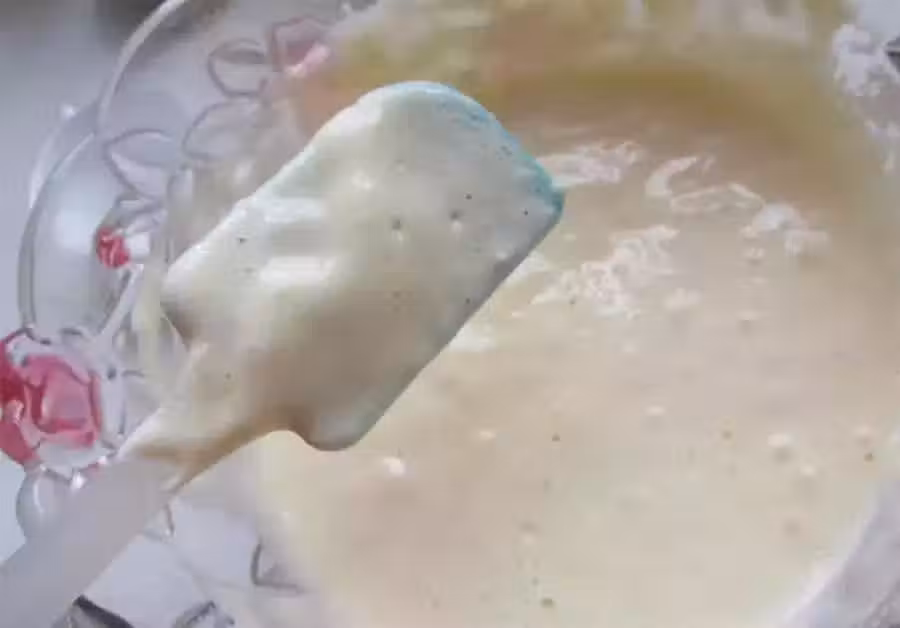 第五步:把蛋白霜分3次放到蛋黃糊中翻拌均勻,不要畫圈攪拌,以防止麵粉出筋,拌好後成為細膩的蛋糕糊。