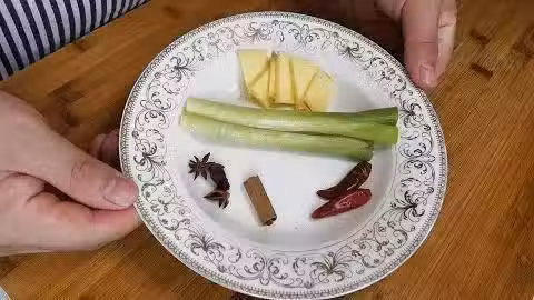 4.準備一些輔料,有蔥段、薑片、八角、桂皮、紅辣椒。