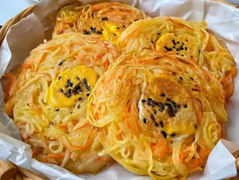 (1)土豆和胡蘿卜用堿面洗凈,去皮擦成絲,小蔥剝皮洗凈,切成蔥花備用。