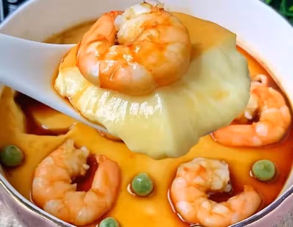 (4)然後放入鍋中蒸至定型,再揭開保鮮膜,放入腌制好的蝦仁和泡好的豌豆粒。