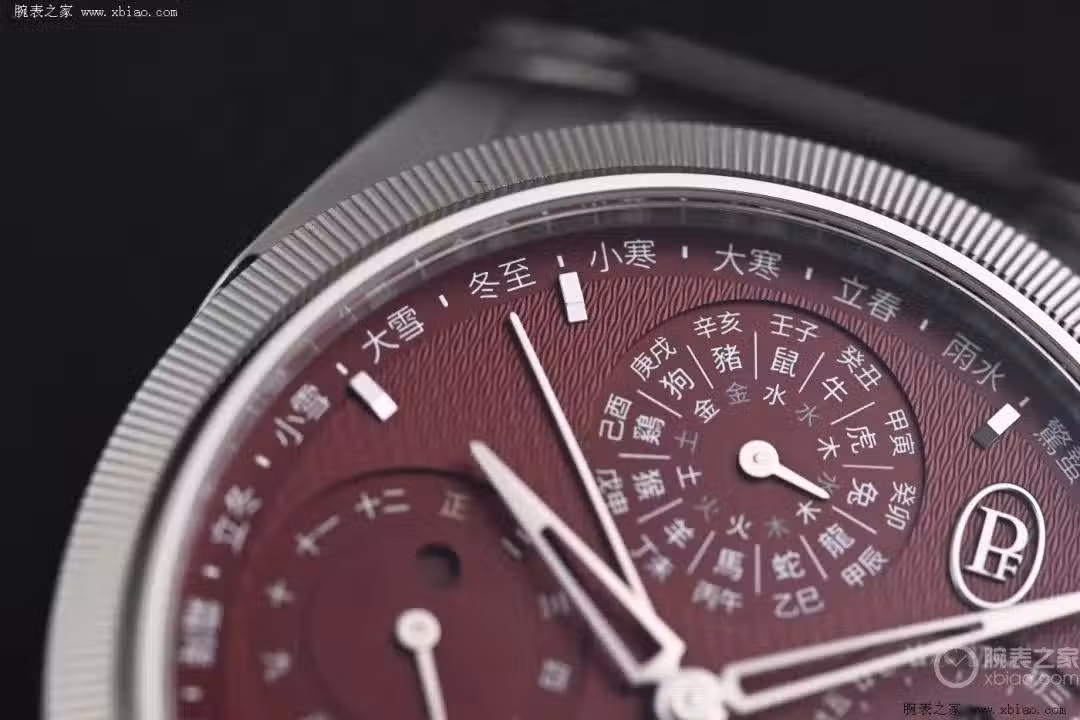 中國古代是以天干、地支來紀錄年份,十天干與太陽循環往復周期相關,從甲乙丙丁開始,天干分屬陰陽,按順序對應木火土金水五行,如甲為陽,乙為陰,甲乙同屬木;十二地支從子丑寅卯開始,同樣分屬陰陽對應十二生肖和十二時辰,如子為陽,丑為陰,所以按照陽配陽,陰配陰的原則,天干配地支共有60種組合,故60年一甲子。以上這些信息,我們都可以在錶盤的12點位迅速找到,另外錶盤9點位的月份盤有閏月顯示,農曆大約每三年一閏,3點位的日曆盤有大小月顯示,農曆小月是29 天,大月是30 天。