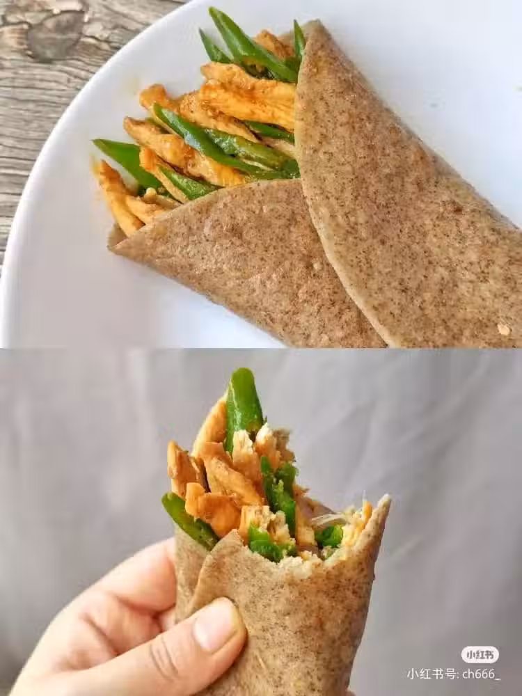 6. 加1勺生抽+1勺蠔油,炒勻出鍋,捲入全麥餅裡即可