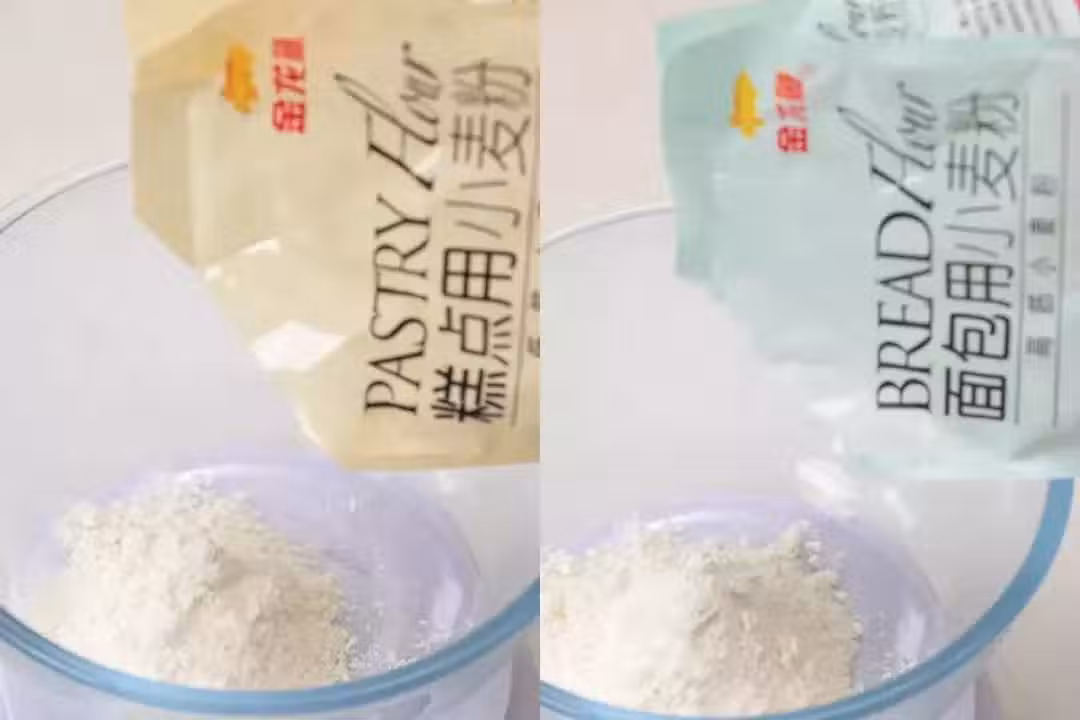 1、先稱取金龍魚低筋麵粉和金龍魚高筋麵粉各63g,其實用中筋麵粉也可以,但很多幫友只有低筋和高筋麵粉,反而沒有中筋麵粉,那就用低筋和高筋麵粉來混合。