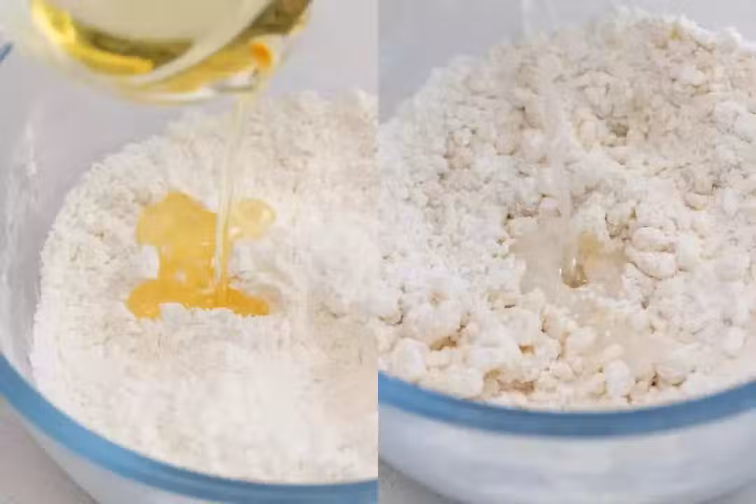 3、再加入22g大豆油和54g清水,先用筷子拌成絮狀。