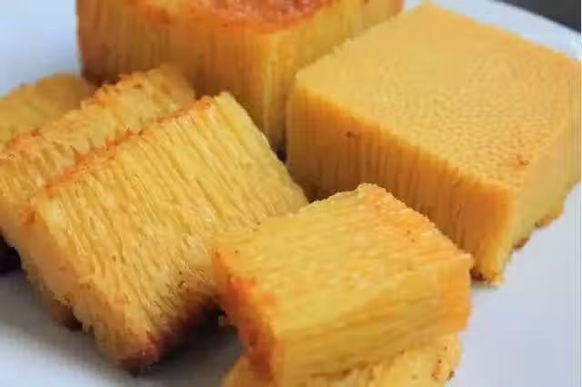 印尼魚翅黃金糕的重要原材料就是南洋木薯,成品象蜂窩狀所以叫蜂窩糕,切片後呈魚翅絲狀又叫魚翅糕