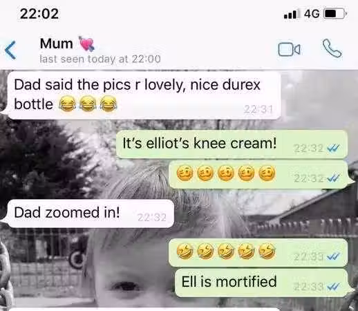 眼尖的父親也查看這對情侶照片,不過他卻發現相片左下方有著橘色罐子,原來那是杜蕾斯潤滑劑。起初,凱爾西還試圖謊稱那罐物品是膝蓋乳霜,沒想到馬上被母親戳破,因為爸爸已經放大相片確認了。