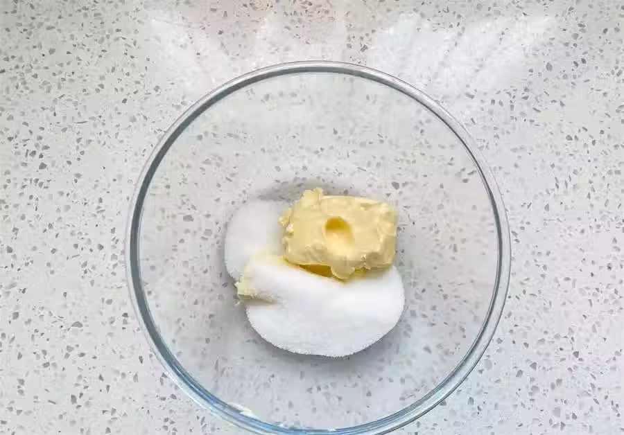 3、先用刮刀把細砂糖和黃油拌在一起,防止打發的時候黃油飛濺,然後用電動打蛋器低速,把黃油打發至顏色變淺,體積膨大,加入1克香草精,分兩次加入全蛋液,完全吸收以後再加下一次蛋液。