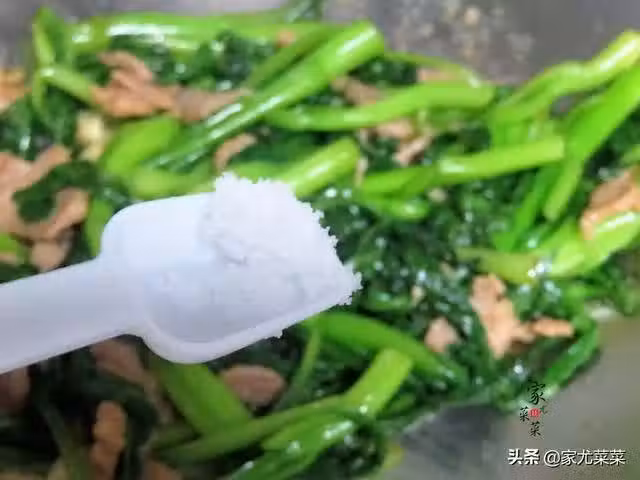 6、最後倒入肉片,再加入小半勺食鹽和幾滴醬油,翻炒幾下即可出鍋。
