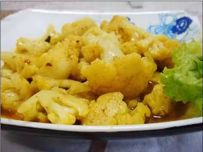 2、起鍋熱油 爆香薑末 放入適量咖喱粉炒勻 加少許水 並用鹽、蘑菇精調味 勾欠後 倒入焯過的菜花 翻炒幾下即可出鍋。