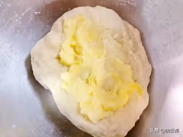 3、給麵糰封上保鮮膜,放在一邊發酵,將麵糰發酵至原來體積的2倍大。