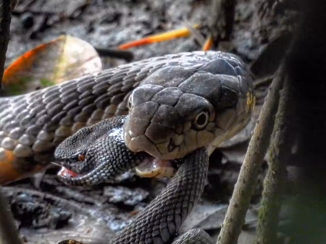 眼鏡王蛇兩小時連吞兩條毒蛇,「竹葉青+狗面水蛇」套餐,第三條由於太小撿回一條命