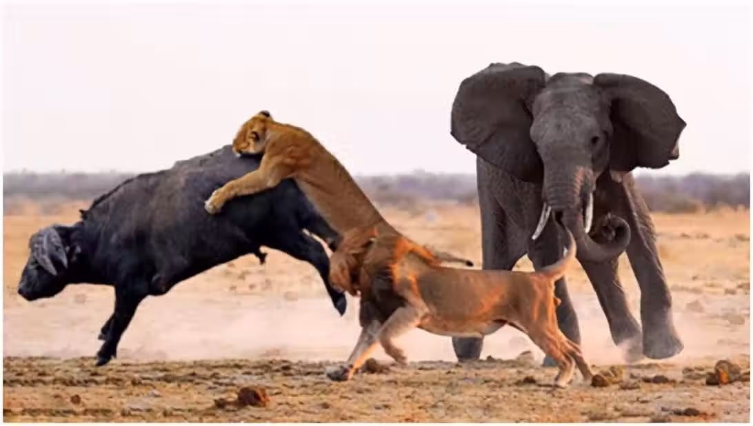 儘管獅子是一種非常強大的肉食動物,也不排除其會成為它們目標獵物的受害者。如果雙方是以群體出動的狀態那就另當別論了,當一個團體齊心協力一致對外時,任何敵者都會畏懼並仔細斟酌是否應該發起攻擊。 強烈的凝聚力和戰鬥力才是不同種類動物得以延續的重要手段,受到威脅時定會群起而攻之,奮力保護自己的族類。