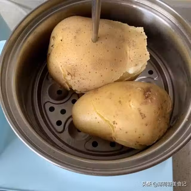 第二步:將土豆去皮,用叉子壓成泥,加入20克牛奶攪拌均勻。
