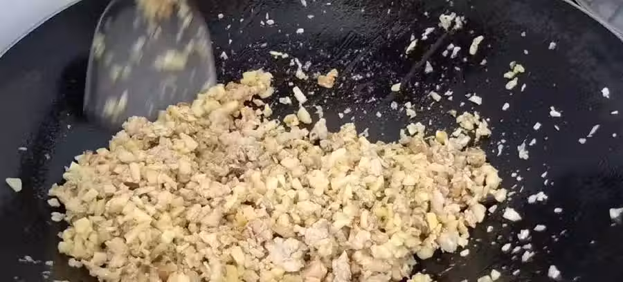 第六步:繼續炒到餡料劈劈【啪啪】響就可以了,然後出鍋,放一邊備用